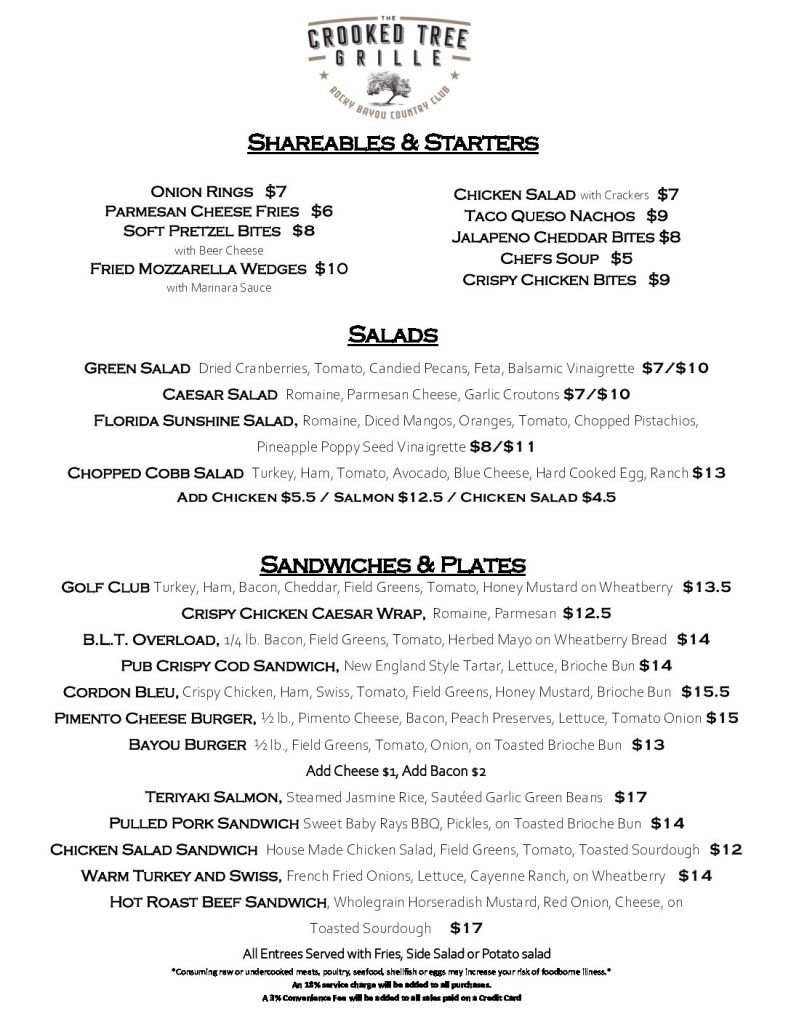 You don’t have to be a member to enjoy The Crooked Tree Grille at Rocky Bayou Country Club! Open 6 days per week with extensive menu and beverage choices, it is the perfect place to enjoy lunch or a cocktail with friends.  With weekday happy hour and Friday Dinners, The Crooked Tree Grille is always the hub of social activity at Rocky Bayou Country Club.
